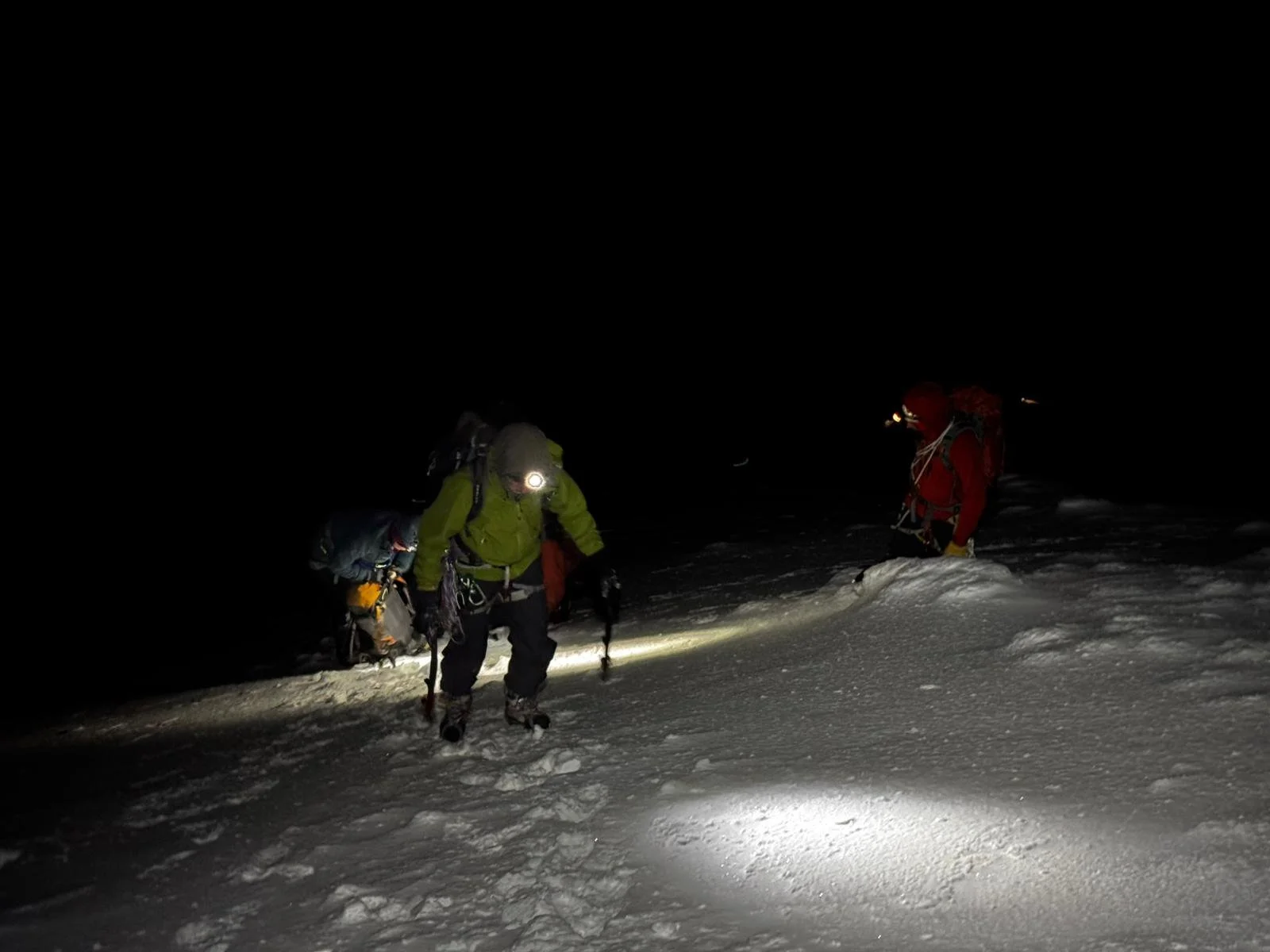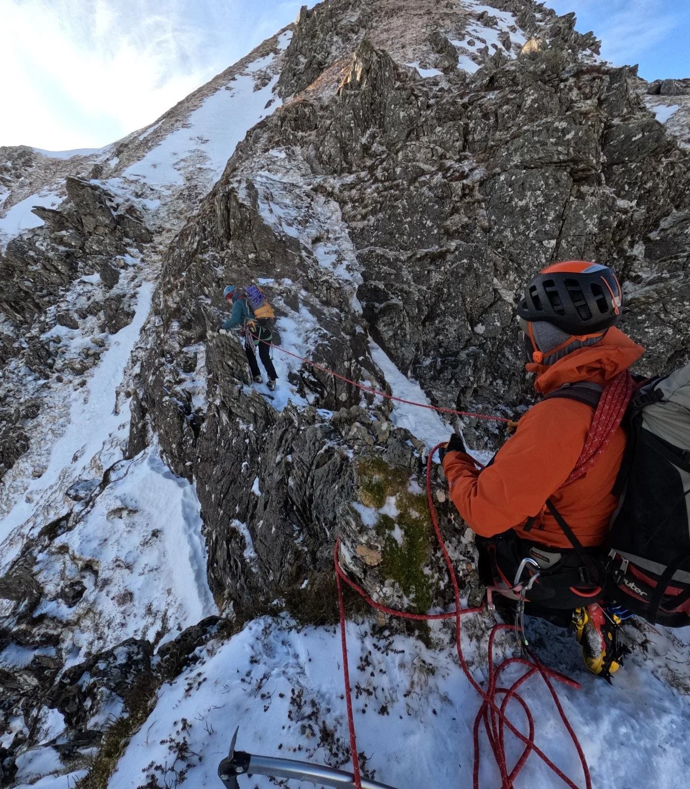 The snow looked minimal on the lower steps, so we kept the ropes coiled in our packs. Danny immediately lured me over to a ‘more interesting’ start, as a result of which we didn’t see the others for the next several hours! We quickly found ourselves at the foot of a vertical wall, with the way forward looking to be up the corner it formed with a more gently angled slab on the left. Having carried them just a few metres up the route — to a much more precarious position — we strapped on the crampons, roped up and ultimately deployed my long legs to overcome the obstacle, which could only have been about 4 m… This proved to be the crux of our route. We moved together for the rest of it, belaying around boulders as required. This line had everything: blocky ridge, chimneys, a tower or two, snowy ledges... And importantly, it was long. With no one else around, it felt like a real adventure. I definitely caught myself thinking that I could have been in the Alps. Or even on Baffin. After topping out, a short snow ridge led to the summit. Cue mountain views in all directions and several minutes spent trying to name as many as possible.