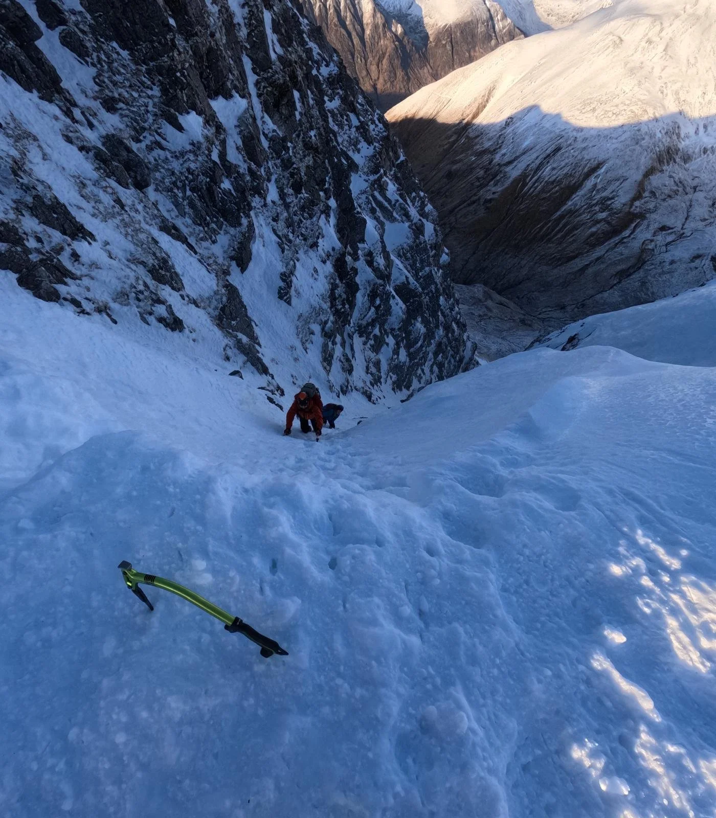 Our line, meanwhile, looked fantastic. What was more, the snow was well consolidated but not so much that you couldn’t kick in a ledge. Early on there was a steepening: about 4 m of 70-degree snow — thankfully this was Danny’s pitch! We ran alt leads, taking a left fork and then, later, another left fork. The belays were scant, at best a T-slot axe belay, more commonly a couple of tiny nuts. We managed to place no more than two bits of gear per pitch. There was, though, one wonderful belay on a ridge between our gully and the next line, which had a thread, a big hex placement and a nice platform to rest on — bliss!