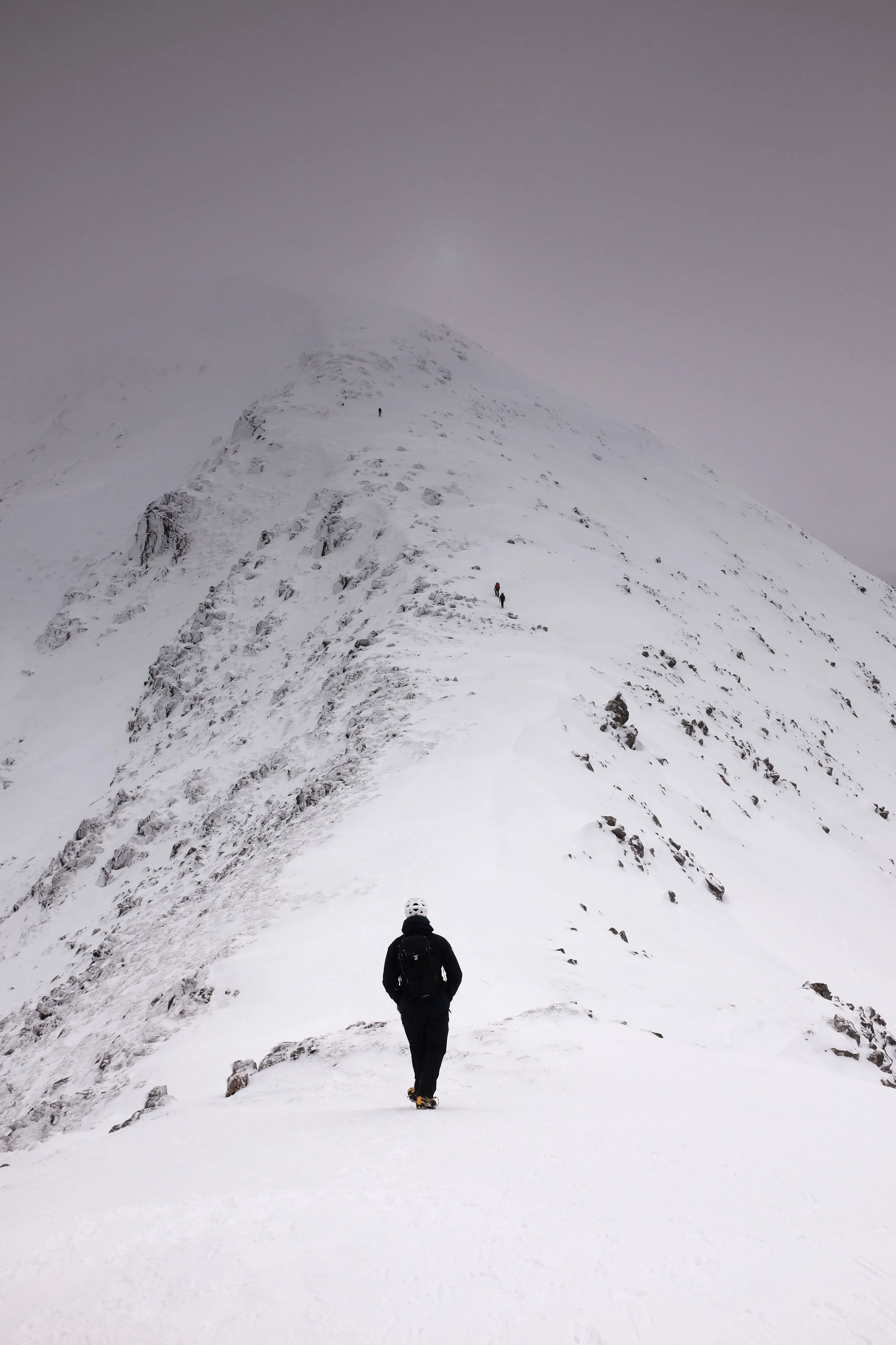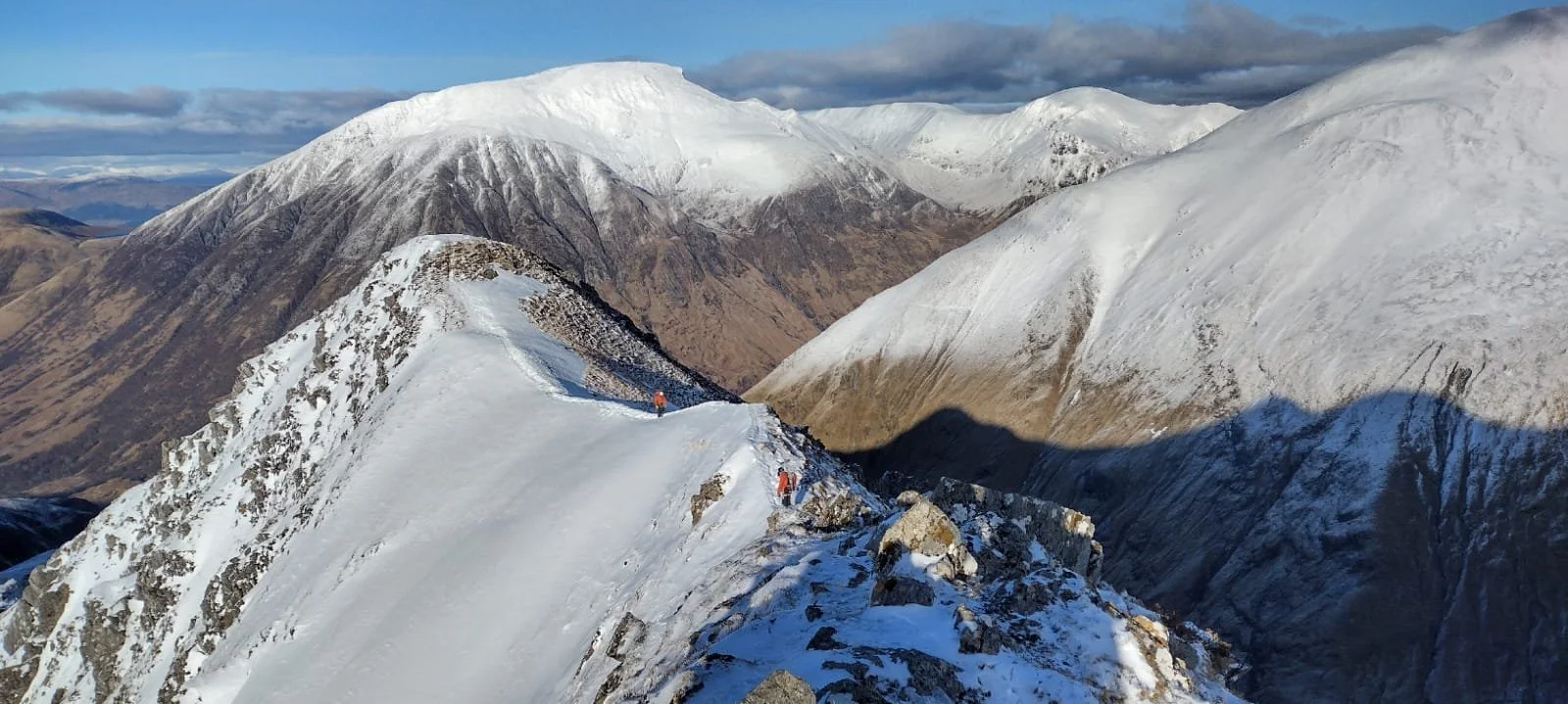 I was extremely keen to head over to the second Munro at the end of the ridge, Stob na Broige. However, this was a kilometre beyond the descent route into Coire Altruim, meaning an extra 2 km total. Understandably, the others weren’t all taken by the idea to extend the day and risk being out in the forecast high winds and snow, so I went ahead. And I have to say, it was well worth the extra distance. The rest of ridge was only gently undulating, with a perfect crest of snow making for rapid progress. The easy terrain also allowed for maximum engagement with the scenery: the ‘little Buckle’, Bidean… From the summit, you could see all the way down to Loch Etive and the sculptural prominence of Ben Starav. The sky was grey now and the highest peaks capped, but there was no sign of any imminent ‘weather’.