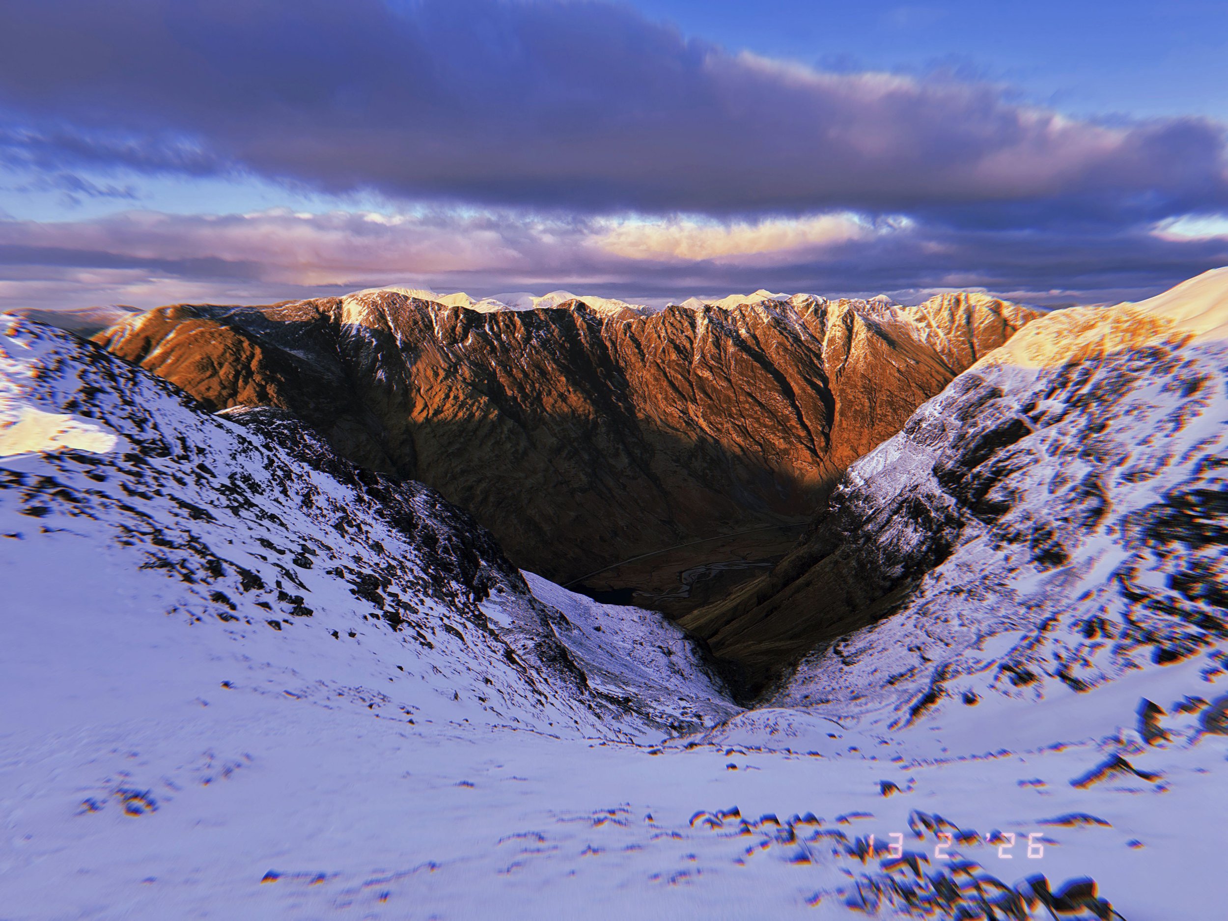 By 16.30, we were still in our gully, despite moving steadily and efficiently (so we thought!), without rest. It had been surprisingly amenable for a supposed grade III. Although we were having fun, I think we both agreed that we’d seen enough gully for one day. Not long after that, we reached a bowl and saw footprints carrying on up a short arete to the left. Deciding that it looked possible to top out slightly quicker by traversing the bowl rightwards — and thereby to perhaps get down before dark — I headed that way. The result was a completely run out 70 m, initially fine and then actually quite steep, with only front points biting into the névé. But the angle did lessen and I emerged into the sunshine and an expansive vista. Here too was a very flat area of ground whence to belay Danny to the top. We must have done 15+ pitches, each a full rope length. By this point, we were ready to get warm, so we snacked quickly, packed the gear and set off. The summit was still and cold, the air infinitely clear, and the colours shifting to the oranges and mauves of sunset. The oblique light illuminated the crest of the Aonach Eagach across the glen.