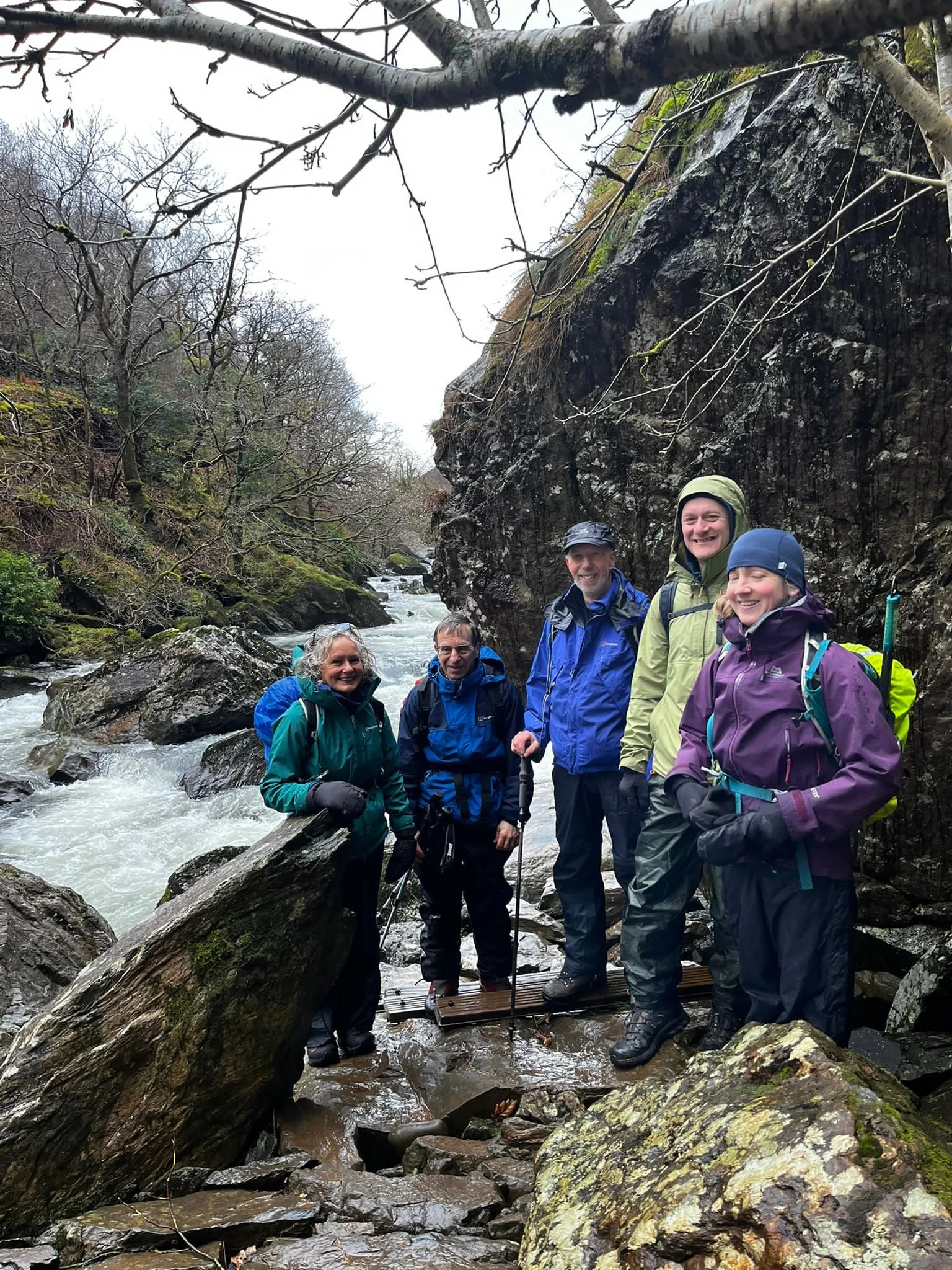 Bernie, Brian, Gill, Helen, Cat and Mark: Started off by catching the S3 Sherpa bus to Beddgelert (£2.20 single, cash or card) with the intention of walking up Moel Hebog. However due to the initial heavy rain and low cloud (and maybe even a lack of moral fibre ?), quickly changed their plans at Beddgelert to a walk along the scenic Snowdonia Slate Trail, just above the river to Aberglaslyn. The heavy rain soon stopped after we started walking and was then mostly dry for rest of the day. Ascended the hills opposite to the Aberglaslyn Pass, where the path on the map did exist, but didn’t on the ground. From here on it was exceedingly boggy, with the water going over and in to a few people’s boots. Away from any good paths the hills are saturated from all the recent rain. We then passed a still inhabited but very run-down farmhouse in the middle of nowhere; just the sort of place that Ray would love to buy and do-up over the next decade or so. We stopped for a late lunch in some pine woods, where we briefly tried out/tested the CMC bright orange group bothy shelter. Soon afterwards we got down to Beddgelert, where we took some liquid refreshments in the Prince Llewelyn Hotel, before walking the 8 km forest path back northwards to Rhyd Ddu.